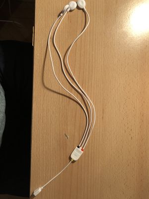- Plug an extension cable into one of the 6 ports of the BITalino (see photo). As each port has its own window in the program, it is necessary to make sure that the window is opened with the same port number (which is not indicated on the box!). For the easiest orientation in the ports, we recommend to use port 1 at all times.