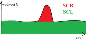 Depending on the method of measurement, we can observe normal, non-stressed, tonic electrodermal activity (SCL - Skin Conductance Level / SPL - Skin Potential Level) when the test subject is at rest and stressed, phasic electrodermal activity in response to a stimulus (SCR - Skin Conductance Response / SPR - Skin Potential Response). In the bipolar electrode connection (two electrodes) used in most devices, the SCL and SCR versus time are part of a single line on a graph, with the SCL appearing as a more or less horizontal line and the SCR as a sudden rise in conductance followed by a sudden descent. The entire SCR curve generally returns to its original position within 1 to 3 seconds after a single isolated stress stimulus. Similarly, the delay between the stress stimulus and the change in skin conductance (visible in the EDA curve) is usually another 1 to 3 seconds. This delay is due to the time lag between the following processes: sensory perception of the stimulus → processing of the sensation in the CNS → parasympathetic conduction → increased sweat gland activity[1].