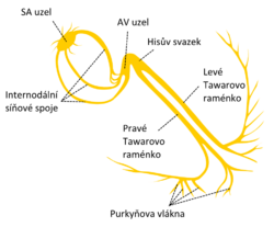 Excitation (depolarization) usually begins in the sinoatrial node. It propagates as a wave through the atrial musculature. It may pass to the ventricles via the atrioventricular node, His bundle, Tawar's arms, and Purkinje fibers. The atria are electrically isolated from the ventricles.