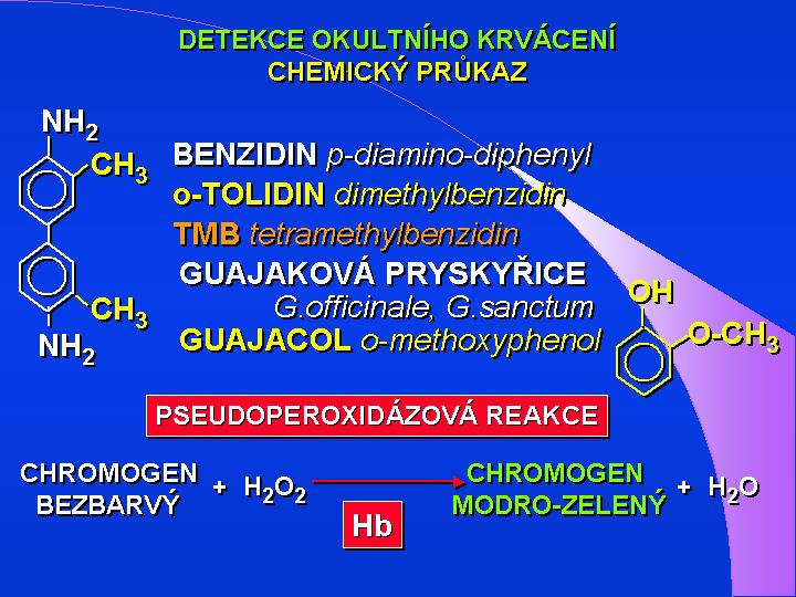Haemoccult or guaiac occult bleeding test is used to screen for colorectal cancer. Standard occult bleeding tests - TOKS, Haemoccult test, are based on the chemical principle, the pseudoperoxidase reaction of hemoglobin. The substrate was originally benzidine, as a carcinogen, it was modified to non-carcinogenic dimethylbenzidine-o-tolidine (eg German KryptoHaem), or tetramethylbenzidine (TMB). Today, tests with guaiac resin - from Guajacum Officinale / sanctum - containing guaiacol (o-methoxyphenol), a benzidine-type substrate, are used. In the leucoform it is colorless, oxidized turns blue-green. Oxidation takes place with hydrogen peroxide, the catalyst is hemoglobin with pseudoperoxidase activity. Due to the chemical principle of the oxidation reaction, the test result may be affected by the presence of other oxidizing substances (vitamin C), the presence of hemoglobin from food (meat, blood), false-positive result may be caused by the presence of plant peroxidases (some root vegetables). The guidelines of the Ministry of Health of the Czech Republic for the search and early diagnosis of colorectal tumors - screening - clearly specify Haemoccult as a suitable, recommended and verified test. Controlled TOKS screening significantly reduces the incidence of colorectal cancer.
