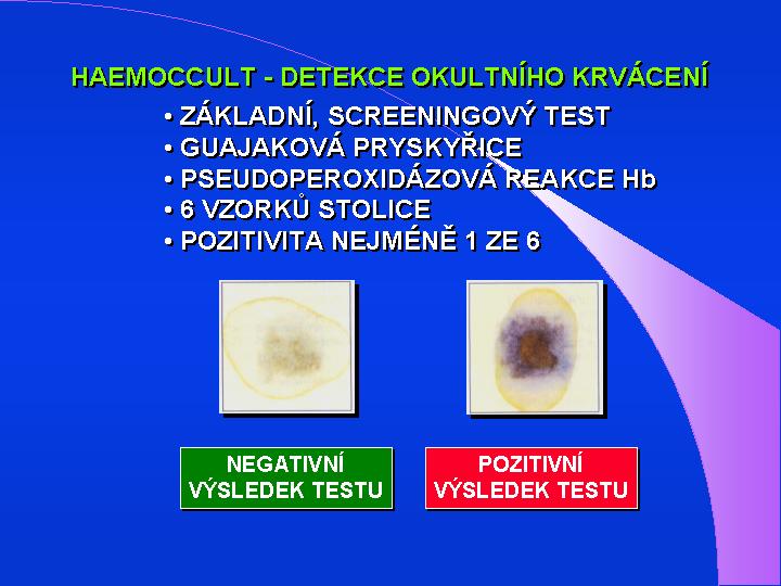 A kit is supplied for screening, which contains 3 tests with two windows and plastic or wooden stools for stool collection. The patient always takes two different samples from three consecutive stools, which he spreads on the marked test sites, closes the test windows and sends the tests to the laboratory. Laboratory processing consists in applying the detection reagent to the opposite side of the windows and evaluating any color change. The evaluation is qualitative, each test where a specific blue-green coloration is evaluated is positive. The Haemoccult test sensitivity / cut-off value is set at about 5 mg Hb / g stool. In the study performed at ÚKBLD 1. LF UK and VFN in> 95,000 asymptomatic persons, the Haemoccult test posed a positivity of 2.8%, the false positivity tested in comparison with immunochemical tests was zero.