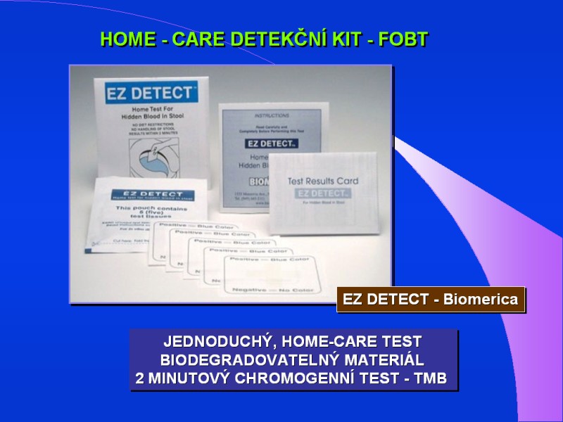 The EZ Detect test, a 2-minute chromogenic test designed for home use, is also based on the chemical principle of blood detection in the stool. The patient performs the test and evaluates it. The test is made of biodegradable material, the substrate is tetramethylbenzidine (TMB).