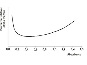 Most photometers can measure absorbance in the range of 0 to 3 or 4. However, this does not mean that measuring over this entire range is reasonable. Assuming that the random error of the detector will always have the same properties, the average relative error of the absorbance measurement as a function of the actual absorbance of the sample will have a U-shaped curve. The best results will be obtained if the absorbance of the sample is in the range of 0.2 to 0.8, measurements in the range of 0.2 to 1.2 can be considered reasonable. If the absorbance is higher, it is advisable to dilute the sample. Of course, the specific values depend on the properties of the photometer used, but the course of the average relative error as a function of absorbance will still be the same (only the "stretching" of the curve differs).