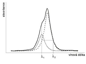 In the simplest case, it is necessary to determine the concentration of one substance, while its absorption spectrum (dotted in the figure) overlaps the spectrum of another substance present in the sample (dashed). By measuring the sample, we obtain a spectrum that is the sum of both absorption spectra (solid line). Even if we know that the measured substance has an absorption maximum at the wavelength λ1 , we cannot determine its concentration directly, because at this wavelength the absorbance of the other substance cannot be neglected. However, if we know the shape of the absorption spectrum of the second substance, we can find the wavelength at which it absorbs the same as at the wavelength λ1 (let's call it λ2), i.e. the extinction coefficient is the same for λ1 and λ2. Then the absorbance of the determined substance itself will be
