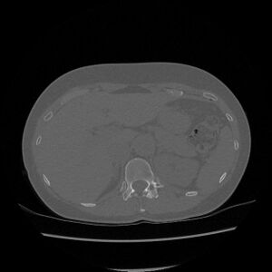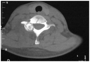 Spinal osteoid osteomas in the vast majority cause painful scoliosis, concavely on the lesion side, vertebral deformities create compression on the spinal cord. The therapy is surgical, or radiofrequency ablation is used. [13][14] náhled|CT – spinální osteoblastom