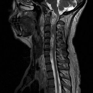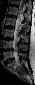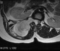 Extramedullary tumors represent the majority of intradural tumors, the vast majority being benign CNS neoplasias. The primary treatment is in most cases surgical, according to the individual dispositions of the patient there is the possibility of applying radiotherapy or chemotherapy. All symptomatology associated with these tumors is dependent on the location and size of the neoplasia, primarily spinal cord or cauda compression and related symptoms. [4] náhled|MRI – spinální meningeom