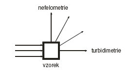 In addition to absorption, when light passes through a sample, it can be scattered when it comes to dispersive or colloidal system. This is used in the techniques of nephelometry (Greek nefele = cloud), when the intensity of light scattered at a certain angle is measured, and turbidimetry (English turbid = cloudy), when the intensity of light is measured passing through the sample in the original direction. Both methods are "mirror" of each other, therefore we will only deal with turbidimetry in the following: it can be carried out using the usual photometric equipment and the loss of light by scattering when passing through the sample can be easily described using absorbance and other quantities usual in photometry.